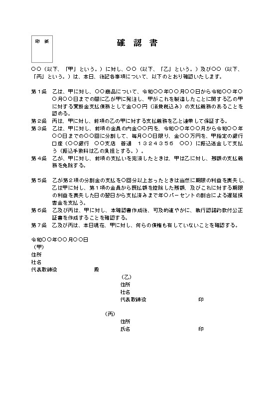 ○○(以下、「甲」という。)に対し、○○(以下、「乙」という。)及び○○(以下、「丙」という。)は、本日、後記各事項について、以下のとおり確認いたします。
