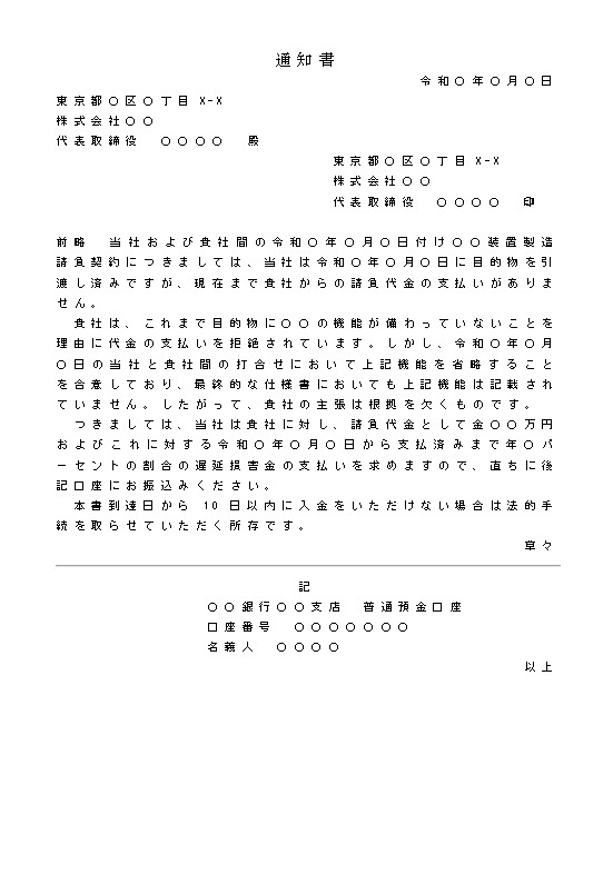 つきましては、当社は貴社に対し、請負代金として金〇〇万円およびこれに対する令和〇年〇月〇日から支払済みまで年〇パーセントの割合の遅延損害金の支払いを求めますので、直ちに後記口座にお振込みください。