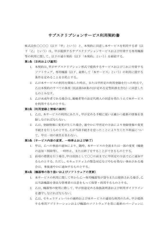 株式会社〇〇〇〇(以下「甲」という)と、本契約に同意し本サービスを利用する者(以下「乙」という)は、甲が提供するサブスクリプションサービスおよび付帯する専用機器等の利用に関して、以下の通り契約(以下「本契約」という)を締結する。