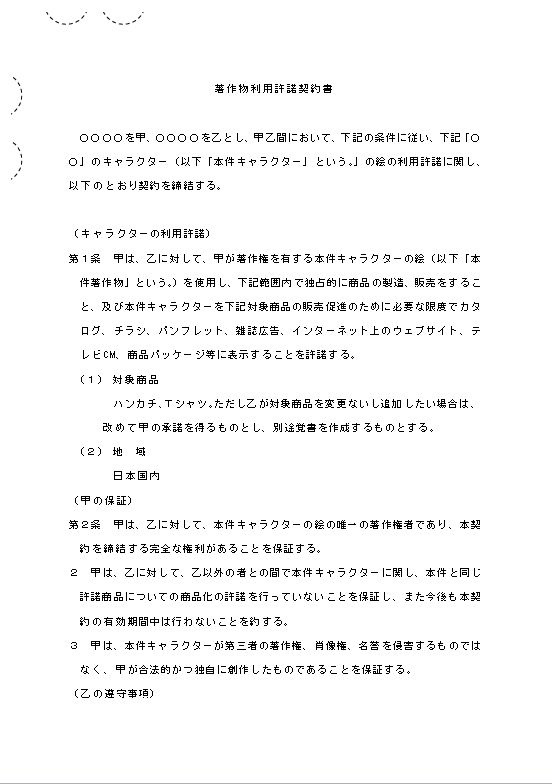 〇〇〇〇を甲、〇〇〇〇を乙とし、甲乙間において、下記の条件に従い、下記「〇〇」のキャラクター(以下「本件キャラクター」という。」の絵の利用許諾に関し、以下のとおり契約を締結する。