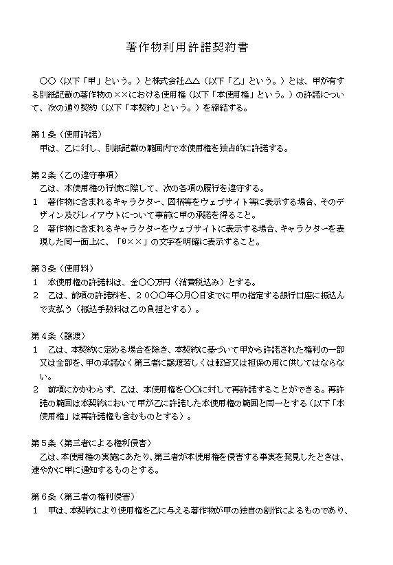 ○○(以下「甲」という。)と株式会社△△(以下「乙」という。)とは、甲が有する別紙記載の著作物の××における使用権(以下「本使用権」という。)の許諾について、次の通り契約(以下「本契約」という。)を締結する。