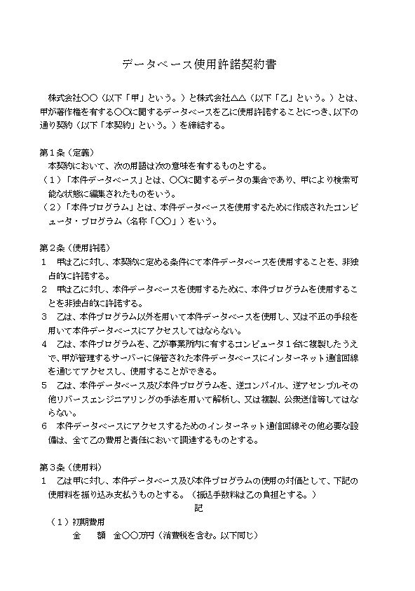 株式会社○○(以下「甲」という。)と株式会社△△(以下「乙」という。)とは、甲が著作権を有する○○に関するデータベースを乙に使用許諾することにつき、以下の通り契約(以下「本契約」という。)を締結する。