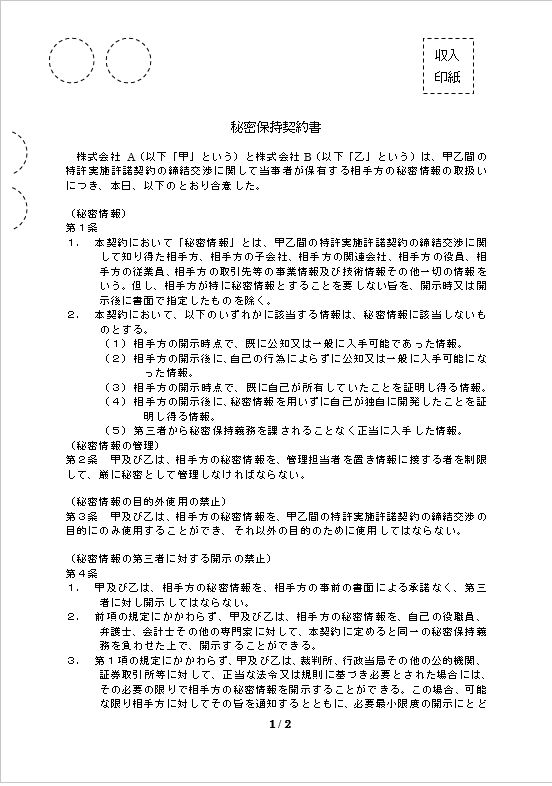 株式会社 A(以下「甲」という)と株式会社B(以下「乙」という)は、甲乙間の特許実施許諾契約の締結交渉に関して当事者が保有する相手方の秘密情報の取扱いにつき、本日、以下のとおり合意した。