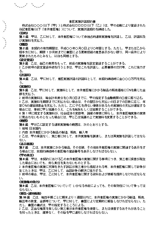 株式会社〇〇〇(以下「甲」)と株式会社□□□□(以下「乙」)は、甲の名義により登録された後記意匠権(以下「本件意匠権」)について、実施許諾契約を締結した。