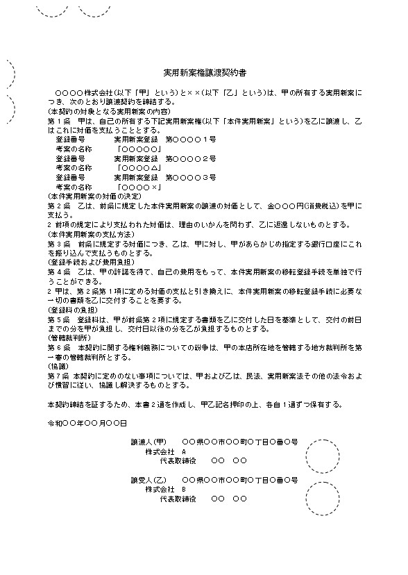 〇〇〇〇株式会社(以下「甲」という)と××(以下「乙」という)は、甲の所有する実用新案につき、次のとおり譲渡契約を締結する。