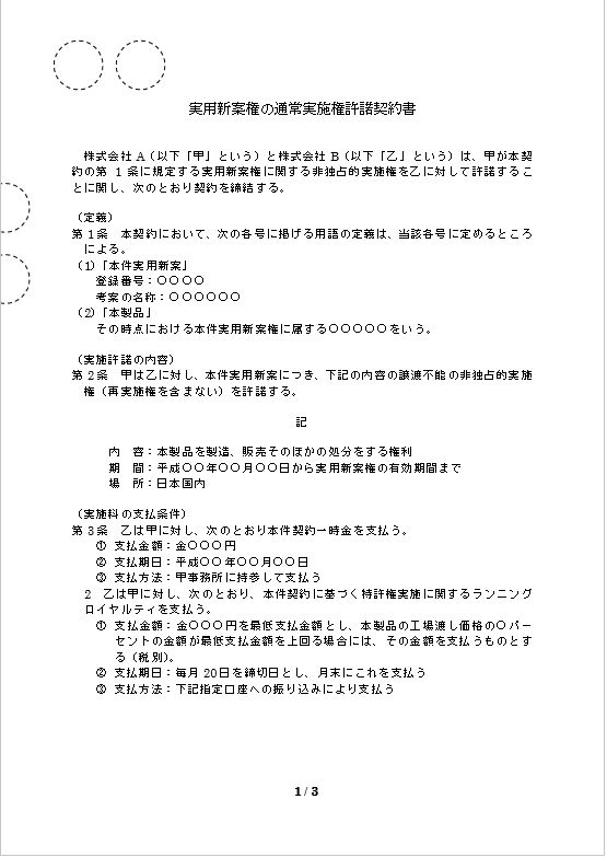 実用新案権の通常実施権許諾契約書