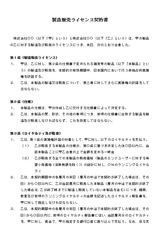 1. 甲は、乙に対し、第2条の仕様書で定められる雑貨等の製品(以下「本製品」という)の製造及び販売を、本契約の有効期間中、日本国内において行う非独占的実施権を許諾する。