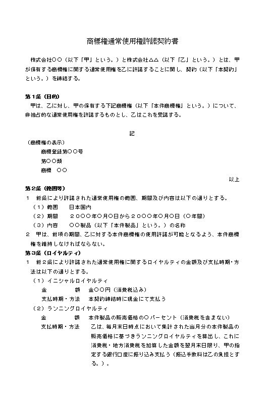 株式会社○○(以下「甲」という。)と株式会社△△(以下「乙」という。)とは、甲が保有する商標権に関する通常使用権を乙に許諾することに関し、契約(以下「本契約」という。)を締結する。