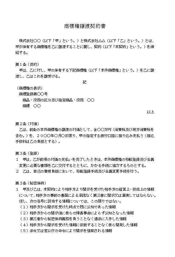 株式会社○○(以下「甲」という。)と株式会社△△(以下「乙」という。)とは、甲が保有する商標権を乙に譲渡することに関し、契約(以下「本契約」という。)を締結する。
