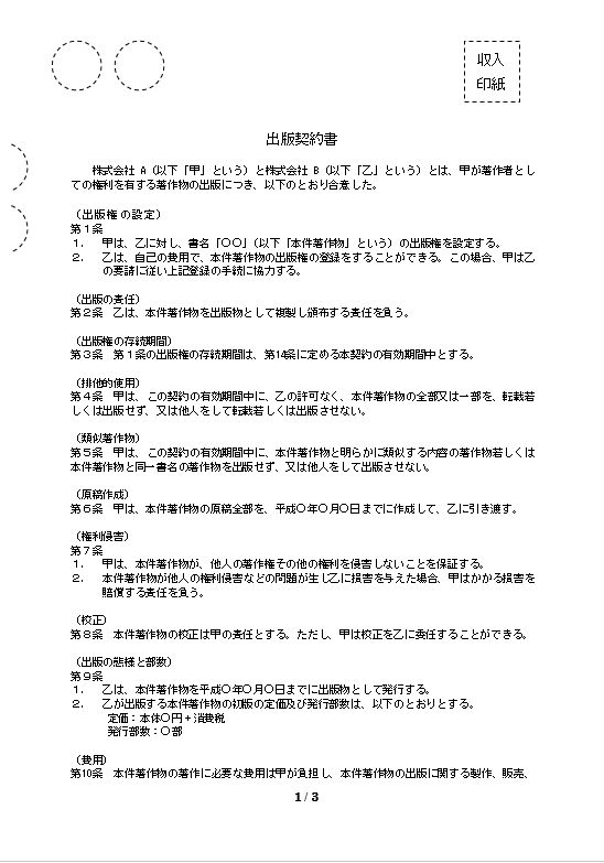 株式会社 A(以下「甲」という)と株式会社B(以下「乙」という)とは、甲が著作者としての権利を有する著作物の出版につき、以下のとおり合意した。