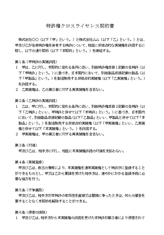 株式会社○○(以下「甲」という。)と株式会社△△(以下「乙」という。)とは、甲及び乙が各自特許権を保有する特許について、相互に非独占的な実施権を許諾するに際し、以下の通り契約(以下「本契約」という。)を締結する。