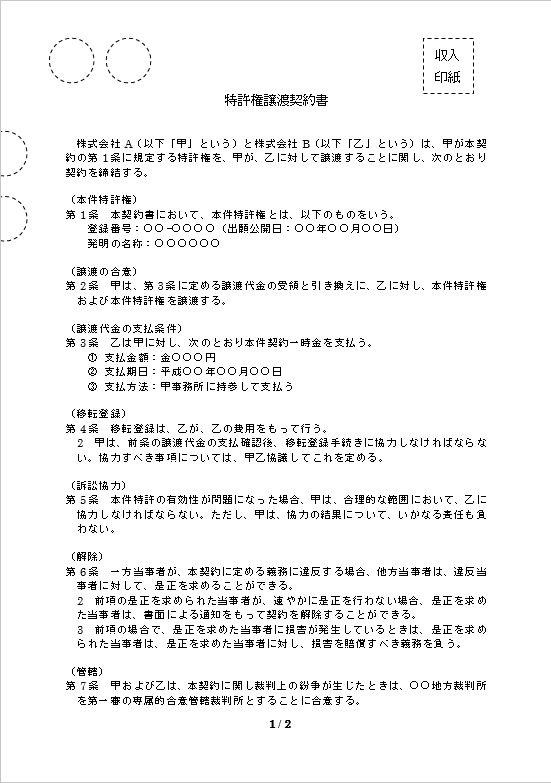 株式会社A(以下「甲」という)と株式会社B(以下「乙」という)は、甲が本契約の第1条に規定する特許権を、甲が、乙に対して譲渡することに関し、次のとおり契約を締結する。