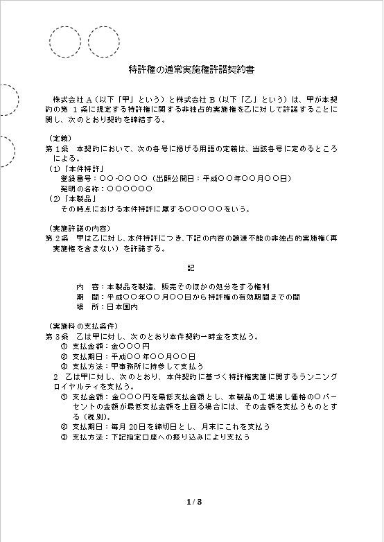 株式会社A(以下「甲」という)と株式会社B(以下「乙」という)は、甲が本契約の第1条に規定する特許権に関する非独占的実施権を乙に対して許諾することに関し、次のとおり契約を締結する。