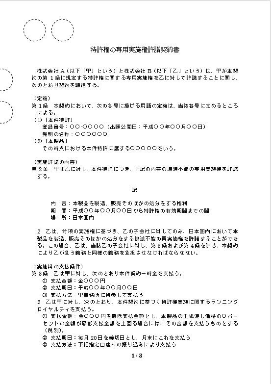 特許権の専用実施権許諾契約書