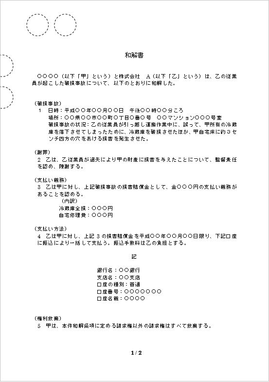 ○○○○(以下「甲」という)と株式会社 A(以下「乙」という)は、乙の従業員が起こした破損事故について、以下のとおりに和解した。