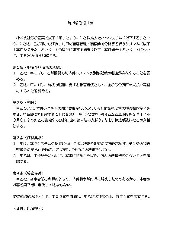 株式会社○○産業(以下「甲」という。)と株式会社△△システム(以下「乙」という。)とは、乙が甲から請負った甲の顧客管理・顧客動向分析等を行うシステム(以下「本件システム」という。)の開発に関する紛争(以下「本件紛争」という。)について、本日次の通り和解する。