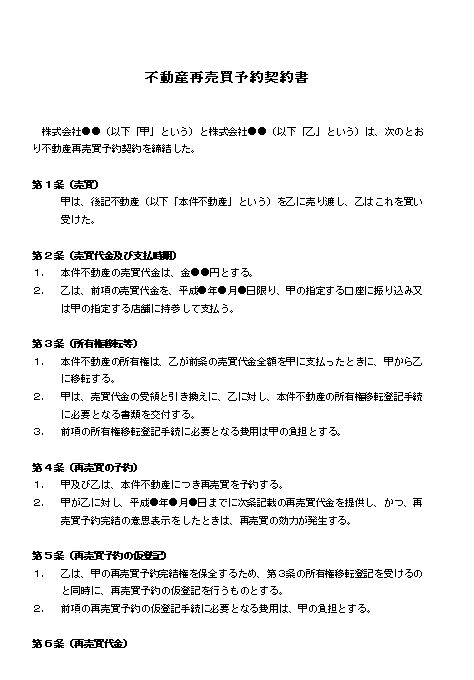 株式会社○○(以下「甲」という)と株式会社○○(以下「乙」という)は、次のとおり不動産再売買予約契約を締結した。