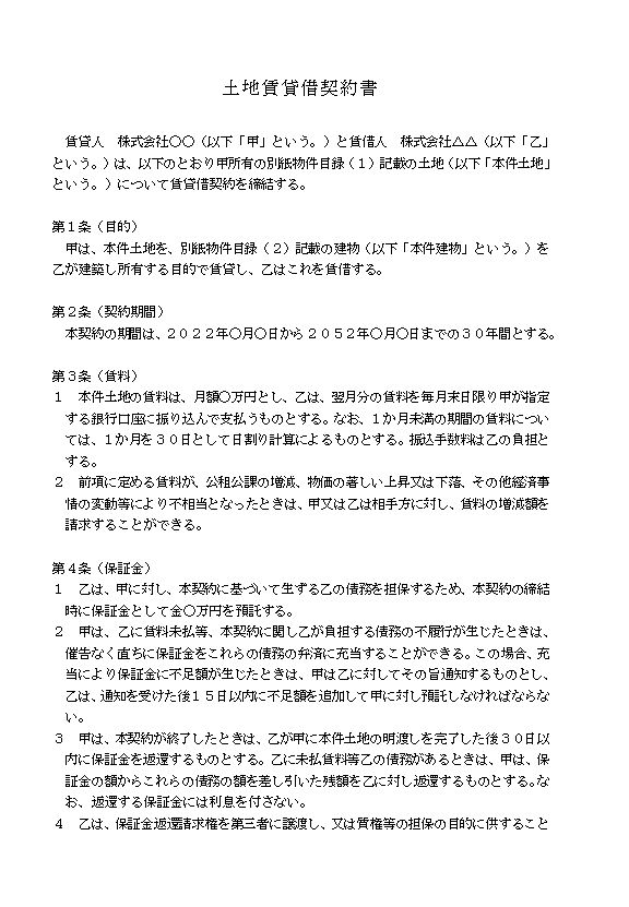 賃貸人 株式会社◯◯(以下「甲」という。)と賃借人 株式会社△△(以下「乙」という。)は、以下のとおり甲所有の別紙物件目録(1)記載の土地(以下「本件土地」という。)について賃貸借契約を締結する。