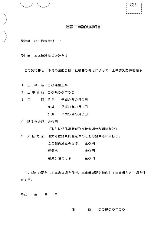 建設工事請負契約書 発注者 〇〇株式会社 と 受注者 △△建設株式会社とは この契約書と、添付の図面〇枚、仕様書〇冊とによって、工事請負契約を結ぶ。 1 工事名 〇〇建設工事 2 工事場所 〇〇県〇〇市〇〇 3 工期 着手 平成〇年〇月〇日 完成 平成〇年〇月〇日 引渡 平成〇年〇月〇日 4 請負代金額 金〇円 (取引に係る消費税及び地方消費税額は別途) 5 支払方法 注文者は請負代金を次のとおり請負者に支払う。 この契約成立のとき 金〇円 部分払 金〇円 完成引渡のとき 金〇円 この契約の証として本書2通を作り、当事者が記名捺印して当事者が各1通を保有する。 平成 年 月 日 住所 〇〇県〇〇市〇〇 発注者 〇〇株式会社 代表取締役 〇〇 〇〇 印 住所 〇〇県〇〇市〇〇 発注者保証人 〇〇 〇〇 印 住所 〇〇県〇〇市〇〇 受注者 △△建設株式会社 代表取締役 〇〇 〇〇 印 住所 〇〇県〇〇市〇〇 受注者保証人 □□建設株式会社 代表取締役 〇〇 〇〇 印 約 款 (総則) 第1条 発注者及び受注者は、各々が対等な立場において、日本国の法令を遵守して、互いに協力し、信義を守り、この約款(契約書を含む。以下同じ。)に基づき、設計図書(添付の設計図、仕様書、現場説明書及びその質問回答書をいう。以下同じ。)に従い、誠実にこの契約(この約款及び設計図書を内容とする請負契約をいい、その内容を変更した場合を含む。以下同じ。)を履行する。 2 受注者は、この契約に基づいて、工事を完成し、この契約の目的物を発注者に引き渡すものとし、発注者は、その請負代金の支払を完了する。 3 この約款の各条項に基づく協議、承諾、通知、指示、請求等は、この約款に別に定めるもののほか、原則として、書面により行う。 4 監理者は、この契約とは別に発注者と監理者との間で締結された監理業務(建築士法第2条第7項で定める工事監理並びに同法第18条第3項及び第20条第3項で定める工事監理者の業務を含む。以下同じ。)に関する委託契約(以下「監理契約」という。)に基づいて、この契約が円滑に遂行されるように協力する。 5 発注者は、第9条第1項各号に掲げる事項その他この契約に定めのある事項と異なることを監理者に委託したときは、速やかに書面をもって受注者に通知する。 6 発注者は、受注者の求め又は設計図書の作成者の求めにより、設計図書の作成者が行う設計意図を正確に伝えるための質疑応答又は説明の内容を受注者に通知する。 (工事用地の確保等) 第2条 発注者は、工事用地その他設計図書において発注者が提供するものと定められた施工上必要な用地等を、施工上必要と認められる日(設計図書に別段の定めがあるときは、その定められた日)までに確保し、受注者の使用に供する。 (関連工事の調整) 第3条 発注者は、その発注に係る第三者の施工する他の工事で受注者の施工する工事と密接に関連するもの(以下「関連工事」という。)について、必要があるときは、それらの施工につき、調整を行うものとする。この場合において、受注者は、発注者の調整に従い、第三者の施工が円滑に進捗し、完成するよう協力しなければならない。 2 前項において、発注者が関連工事の調整を監理者又は第三者に委託した場合には、発注者は、速やかに書面をもって受注者に通知する。 (請負代金内訳書及び工程表) 第4条 受注者は、この契約を締結した後、速やかに請負代金内訳書及び工程表を監理者に提出し、請負代金内訳書については、監理者の確認を受ける。 (一括委任又は一括下請負の禁止) 第5条 受注者は、工事の全部若しくはその主たる部分又は他の部分から独立して機能を発揮する工作物の工事を一括して第三者に委任し、又は請け負わせることはできない。ただし、共同住宅の新築工事以外の工事で、かつ、あらかじめ発注者の書面による承諾を得た場合は、この限りではない。 (権利義務の譲渡等) 第6条 発注者及び受注者は、相手方の書面による承諾を得なければ、この契約により生ずる権利又は義務を第三者に譲渡し、又は承継させることはできない。 2 発注者及び受注者は、相手方の書面による承諾を得なければ、この契約の目的物並びに検査済の工事材料及び建築設備の機器(いずれも製造工場等にある製品を含む。以下同じ。)を第三者に譲渡し、若しくは貸与し、又は抵当権その他の担保の目的に供することはできない。 (特許権等の使用) 第7条 受注者は、特許権、実用新案権、意匠権、商標権その他日本国の法令に基づき保護される第三者の権利(以下「特許権等」という。)の対象となっている工事材料、建築設備の機器、施工方法等を使用するときは、その使用に関する一切の責任を負わなければならない。ただし、発注者がその工事材料、建築設備の機器、施工方法等を指定した場合において、設計図書に特許権等の対象である旨の明示がなく、かつ、受注者がその存在を知らなかったときは、発注者は、受注者がその使用に関して要した費用を負担しなければならない。 (保証人) 第8条 