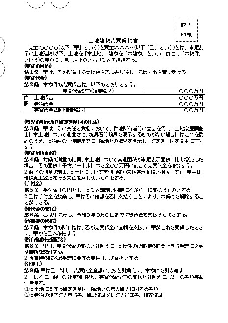 土地建物売買契約書 売主:〇〇〇〇(以下「甲」という)と買主:△△△△(以下「乙」という)とは、末尾表示の土地建物(以下、土地を「本土地」、建物を「本建物」といい、併せて「本物件」という)の売頁につき、以下のとおり契約を締結する。 (売買の目的) 第1条 甲は、その所有する本物件を乙に売り渡し、乙はこれを買い受ける。 (売買代金) 第2条 本物件の売買代金は、以下のとおりとする。 売買代金総額(消費税込) 〇〇〇万円 内 訳 土地代金 〇〇〇万円 建物代金 〇〇〇万円 売買代金総額(消費税込) 〇〇万円 (境界の明示及び確定測量図の作成) 第3条 甲は、その責任と負担において、隣地所有者等の立会を得て、土地家屋調査士に本土地について測量させ、境界石等境界を明示するものがない場合にはこれを設置のうえ、本物件の引渡時までに、隣地との境界を明示し、確定測量図を買主に交付する。 (売買対象面積) 第4条 前条の測量の結果、本土地について実測面積が末尾表示面積に比し増減した場合、その面積1平方メートルにつき金〇〇万円の割合で売買代金を精算する。 2 前条の測量の結果、本土地について実測面積が末尾表示面積と相違しても、売主は、地積更正登記を行う責任を負わないものとする。 (手付金) 第5条 手付金は〇円とし、本契約締結と同時に乙から甲に支払うものとする。 2 乙は手付金を放棄し、甲はその倍額を乙に支払うことにより、本契約を解除することができる。 (残代金の支払) 第6条 乙は甲に対し、令和〇年〇月〇日までに残代金を支払うものとする。 (所有権の移転) 第7条 本物件の所有権は、乙が売買代金の全額を支払い、甲がこれを受領したときに、甲から乙へ移転する。 (所有権移転登記等) 第8条 甲は、売買代金の支払と引換えに、本物件の所有権移転登記申請手続に必要な書額を交付する。 2 所有権移転登記手続に要する費用は乙の負担とする。 (引渡し) 第9条 甲は乙に対し、売買代金全額の支払と引換えに、本物件を引き渡す。 2 甲は乙に、前項の引渡期日限り、売買代金全額の支払と引換えに、以下の書類等本引き渡す。 (1)本土地に関する確定測量図、隣地との境界確認に関する書類 (2)本建物の建築確認申請書、確認済証又は確認通知書、検査済証 (3)本物件に設置·設定された設備等に関する説明書、保証書その他本物件の管理利用に当たり必要な書類並びに鍵、その他の備品 (契約不適合責任) 第10条 乙は、本物件の引渡後、3ヶ月以内に甲に通知をした場合に限り、本物件が種類、品質に関して本契約の内容に適合しないものであることを理由として、甲に本物件の修補を請求することができる。 2 前項の場合に甲が負う責任の内容は不具合の修補に限るものとし、乙は甲に、代金減額請求、損害賠償請求又は解除をすることができない。 (抵当権等の抹消) 第11条 甲は、乙に対し、本物件について、第7条の所有権等の移転時期までにその資任と負担において、先取特権、抵当権等の担保権、地上権、賃借権等の用益権その他名目形式の如何を問わず、買主の完全な所有権等の行使を阻害する一切の負担を除去抹消する。 (公租公課の分担) 第12条 本物件に対して賦課される公租公課は、引渡日をもって区分し、その前日までの分を甲が、その日以降の分を乙が負担するものとし、引渡完了日において清算する。 2 公租公課納付分担の起算日は、1月1日とする。 (危険負担) 第13条 甲及び乙は、本物件の引渡前に、天災地変その他甲又は乙のいずれの責めにも帰すことのできない事由によって、本物件が滅失し売主がこれを引き渡すことができなくなったとき、互いに書面により通知して、本契約を解除することができる。また、乙は、本契約が解除されるまでの間、売買代金の支払いを拒むことができる。 2 本物件の引渡前に、前項の事由によって本物件建物が損傷したときは、甲は、本物件を損傷したままの状態で、買主に引き渡すものとする。 3 第1項の規定により本契約が解除されたとき、甲は、乙に対し、受領済みの金員を無利息にてすみやかに返還する。 (解除) 第14条 甲又は乙は、相手方に次の各号のいずれかに該当する事由が生じた場合には、何らの催告なしに直ちに本契約の全部又は一部を解除することができる。 (1)支払の停止があった場合、又は仮差押、差押、競売、破産手続開始、民事再生手続開始、会社更生手続開始、特別清算開始の申立があったとき (2)手形交換所の取引停止処分を受けたとき、又は支払不能処分制度に基づき6ヶ月以内に2回以上電子記録債権の支払不能を生じさせたことにより取引停止処分を受けたとき (3)公租公課の滞納処分を受けたとき (4)背信的行為があったとき (5)その他前各号に準ずるような本契約を継続し難い重大な事由が発生したとき (6)前各号に定めるほか、民法第542条1項で定める要件に該当するとき 2 甲又は乙は、相手方が本契約のいずれかの条項に違反し、相当期間を定めて催告をしたが、相当期間内に、相手方の債務不履行が是