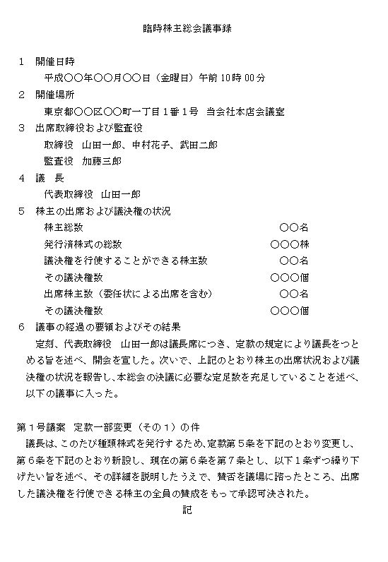 議長は、このたび種類株式を発行するため、定款第5条を下記のとおり変更し、第6条を下記のとおり新設し、現在の第6条を第7条とし、以下1条ずつ繰り下げたい旨を述べ、その詳細を説明したうえで、賛否を議場に諮ったところ、出席した議決権を行使できる株主の全員の賛成をもって承認可決された。