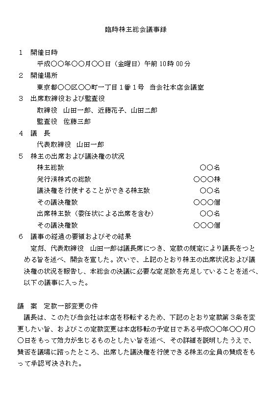 臨時株主総会議事録~本店の移転(定款の変更あり)~