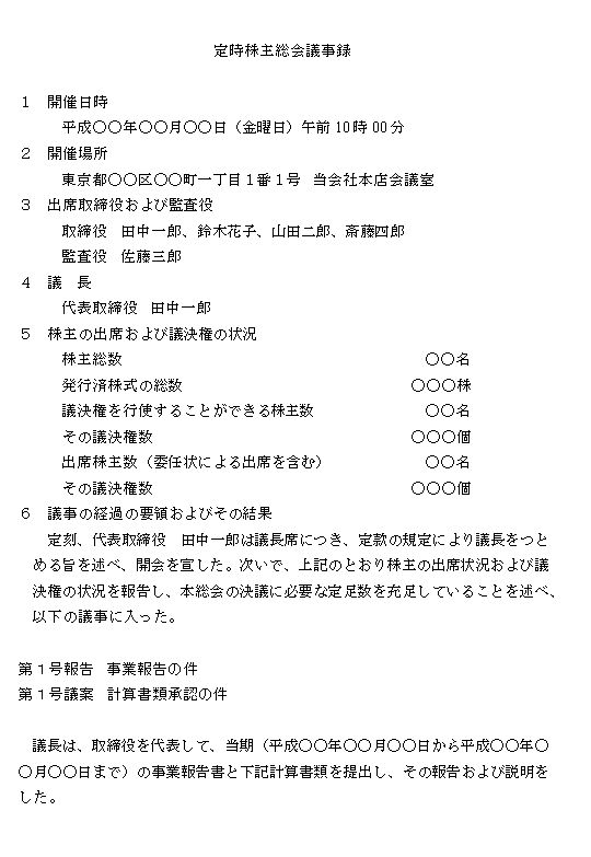 定刻、代表取締役 田中一郎は議長席につき、定款の規定により議長をつとめる旨を述べ、開会を宣した。次いで、上記のとおり株主の出席状況および議決権の状況を報告し、本総会の決議に必要な定足数を充足していることを述べ、以下の議事に入った。