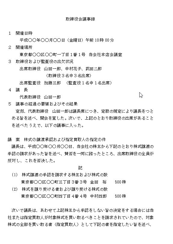 取締役会議事録~株式の譲渡を承認せず指定買取人を指定する場合~