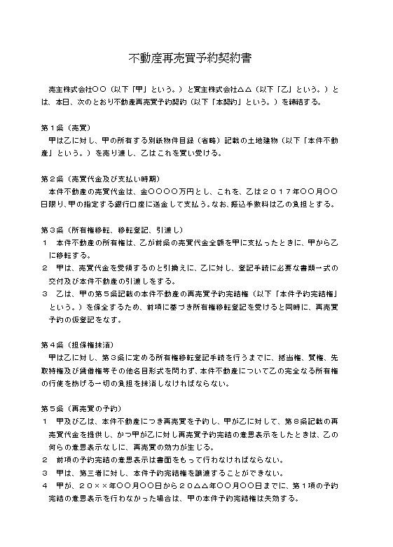売主株式会社○○(以下「甲」という。)と買主株式会社△△(以下「乙」という。)とは、本日、次のとおり不動産再売買予約契約(以下「本契約」という。)を締結する。