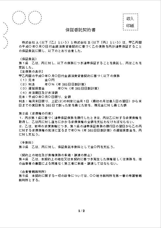 第1条 乙は、丙に対し、以下の債務につき連帯保証することを委託し、丙はこれを受託した。