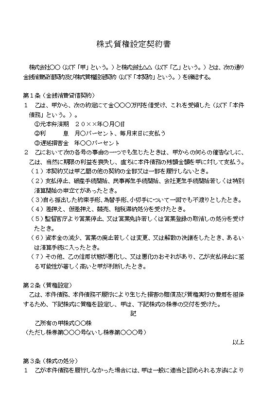 株式会社○○(以下「甲」という。)と株式会社△△(以下「乙」という。)とは、次の通り金銭消費貸借契約及び株式質権設定契約(以下「本契約」という。)を締結する。