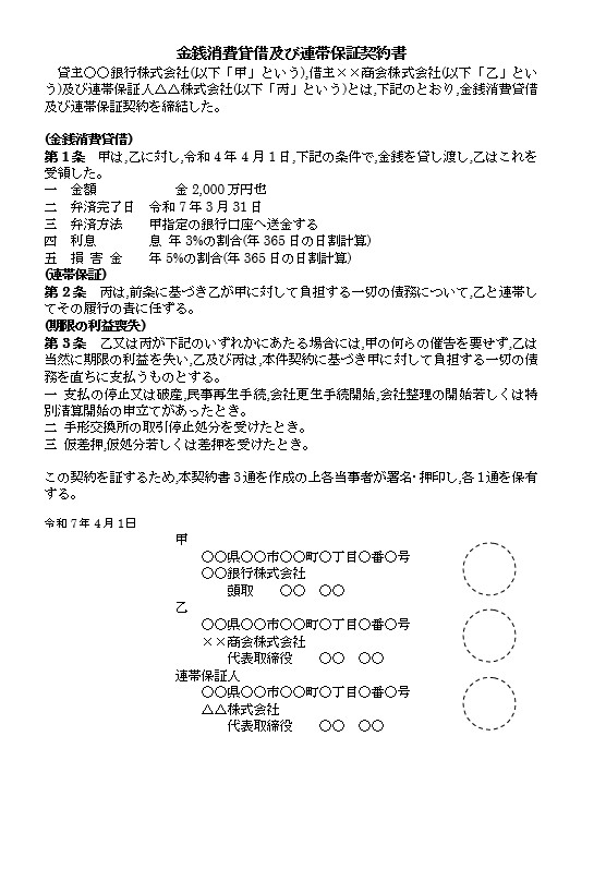 金銭消費貸借及び連帯保証契約書 貸主○○銀行株式会社(以下「甲」という),借主××商会株式会社(以下「乙」という)及び連帯保証人△△株式会社(以下「丙」という)とは,下記のとおり,金銭消費貸借及び連帯保証契約を締結した。 (金銭消費貸借) 第1条 甲は,乙に対し,令和4年4月1日,下記の条件で,金銭を貸し渡し,乙はこれを受領した。 一 金額 金2,000万円也 二 弁済完了日 令和7年3月31日 三 弁済方法 甲指定の銀行口座へ送金する 四 利息 息 年3%の割合(年365日の日割計算) 五 損 害 金 年5%の割合(年365日の日割計算) (連帯保証) 第2条 丙は,前条に基づき乙が甲に対して負担する一切の債務について,乙と連帯してその履行の責に任ずる。 (期限の利益喪失) 第3条 乙又は丙が下記のいずれかにあたる場合には,甲の何らの催告を要せず,乙は当然に期限の利益を失い,乙及び丙は,本件契約に基づき甲に対して負担する一切の債務を直ちに支払うものとする。 一 支払の停止又は破産,民事再生手続,会社更生手続開始,会社整理の開始若しくは特別清算開始の申立てがあったとき。 二 手形交換所の取引停止処分を受けたとき。 三 仮差押,仮処分若しくは差押を受けたとき。 この契約を証するため,本契約書3通を作成の上各当事者が署名·押印し,各1通を保有する。 令和7年4月1日 甲 ○○県○○市○○町○丁目○番○号 ○○銀行株式会社 頭取 ○○ ○○ 乙 ○○県○○市○○町○丁目○番○号 ××商会株式会社 代表取締役 ○○ ○○ 連帯保証人 ○○県○○市○○町○丁目○番○号 △△株式会社 代表取締役 ○○ ○○