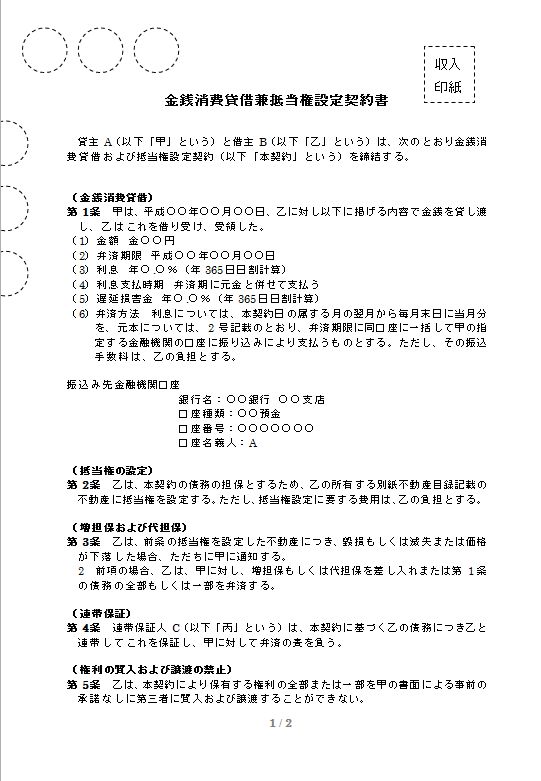 金銭消費貸借兼抵当権設定契約書のテキスト