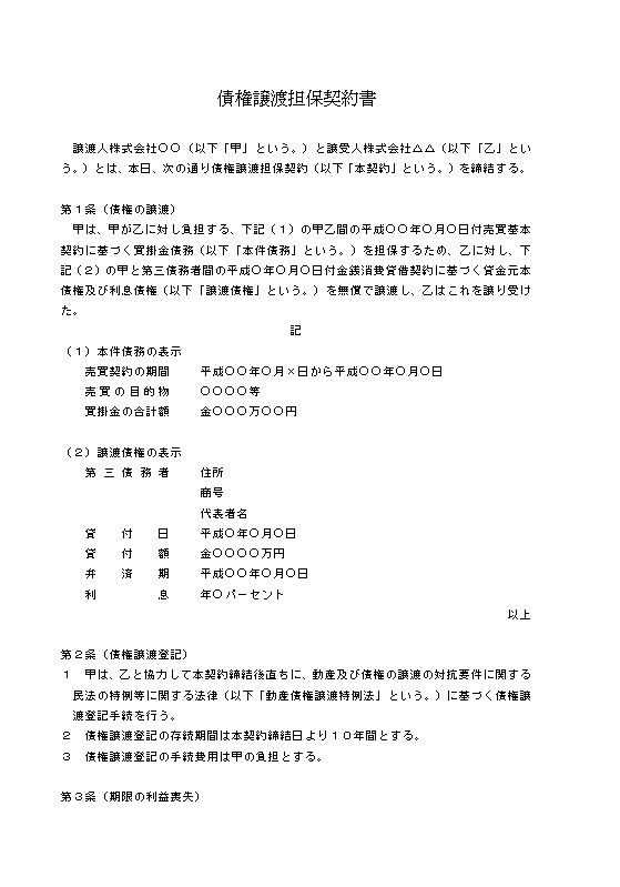 甲は、甲が乙に対し負担する、下記(1)の甲乙間の平成○○年○月○日付売買基本契約に基づく買掛金債務(以下「本件債務」という。)を担保するため、乙に対し、下記(2)の甲と第三債務者間の平成○年○月○日付金銭消費貸借契約に基づく貸金元本債権及び利息債権(以下「譲渡債権」という。)を無償で譲渡し、乙はこれを譲り受けた。