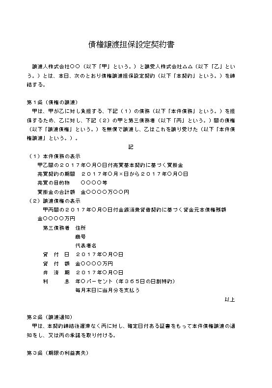 譲渡人株式会社○○(以下「甲」という。)と譲受人株式会社△△(以下「乙」という。)とは、本日、次のとおり債権譲渡担保設定契約(以下「本契約」という。)を締結する。