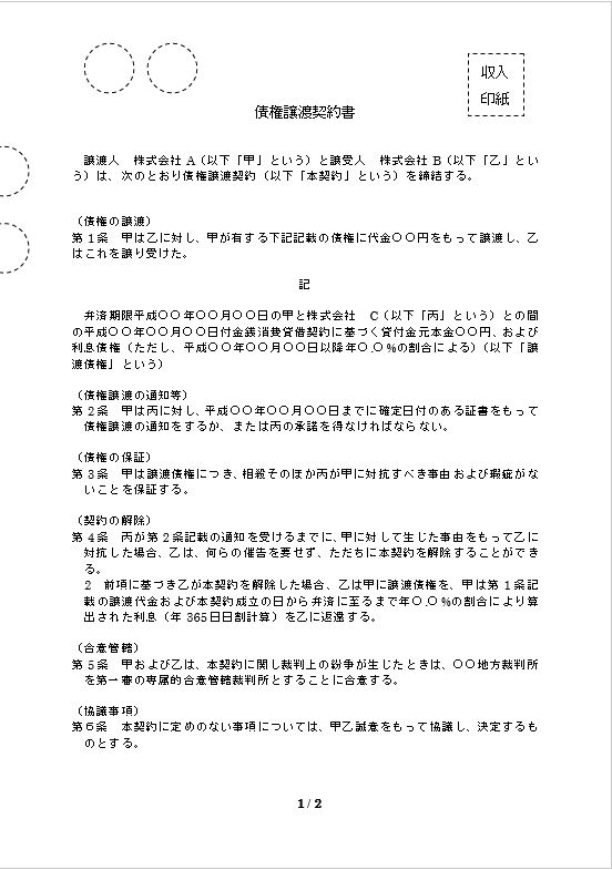 第1条 甲は乙に対し、甲が有する下記記載の債権に代金○○円をもって譲渡し、乙はこれを譲り受けた。