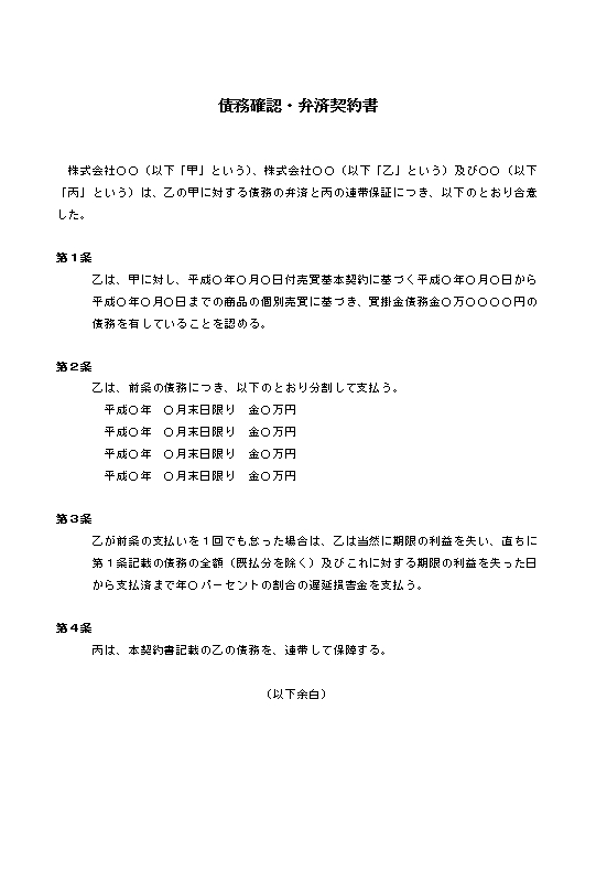 株式会社〇〇(以下「甲」という)、株式会社〇〇(以下「乙」という)及び〇〇(以下「丙」という)は、乙の甲に対する債務の弁済と丙の連帯保証につき、以下のとおり合意した。