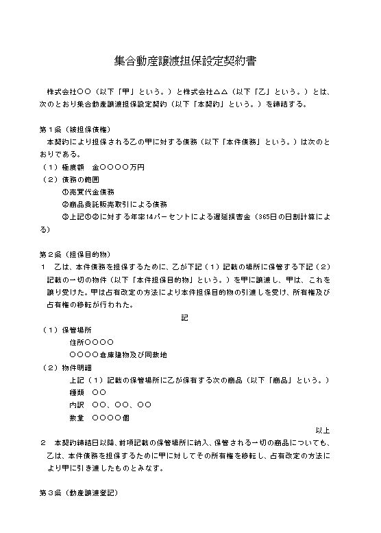 株式会社○○(以下「甲」という。)と株式会社△△(以下「乙」という。)とは、次のとおり集合動産譲渡担保設定契約(以下「本契約」という。)を締結する。