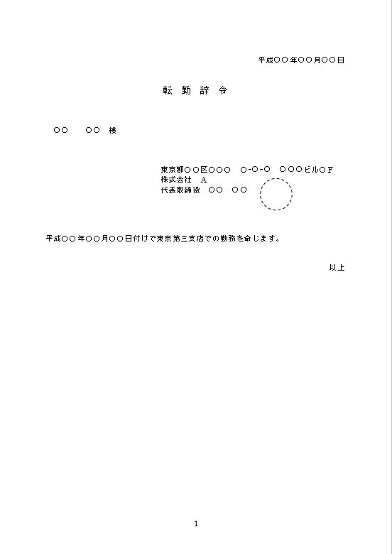 平成○○年○○月○○日 転 勤 辞 令 ○○ ○○ 様 東京都〇〇区〇〇〇 〇−○−○ ○○○ビル〇F 株式会社 A 代表取締役 ○○ ○○ 平成〇〇年〇〇月〇〇日付けで東京第三支店での勤務を命じます。 以上