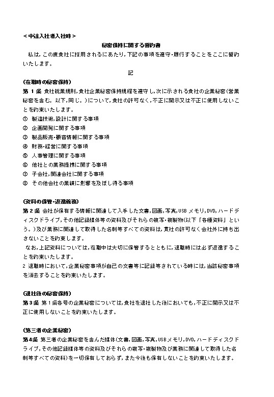 第1条 貴社就業規則,貴社企業秘密保持規程を遵守し,次に示される貴社の企業秘密(営業秘密を含む。以下,同じ。)について,貴社の許可なく,不正に開示又は不正に使用しないことを約束いたします。
