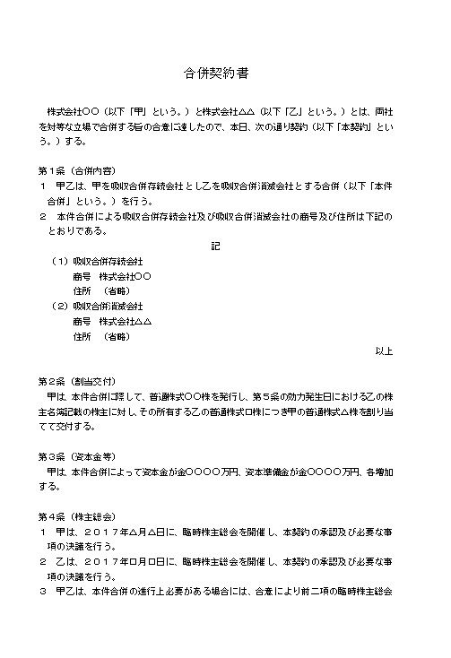 株式会社○○(以下「甲」という。)と株式会社△△(以下「乙」という。)とは、両社を対等な立場で合併する旨の合意に達したので、本日、次の通り契約(以下「本契約」という。)する。