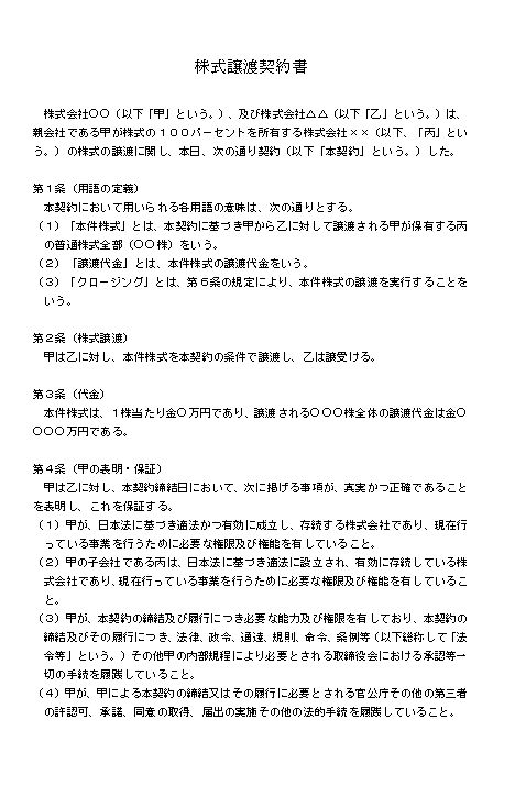 株式会社○○(以下「甲」という。)、及び株式会社△△(以下「乙」という。)は、親会社である甲が株式の100パーセントを所有する株式会社××(以下、「丙」という。)の株式の譲渡に関し、本日、次の通り契約(以下「本契約」という。)した。