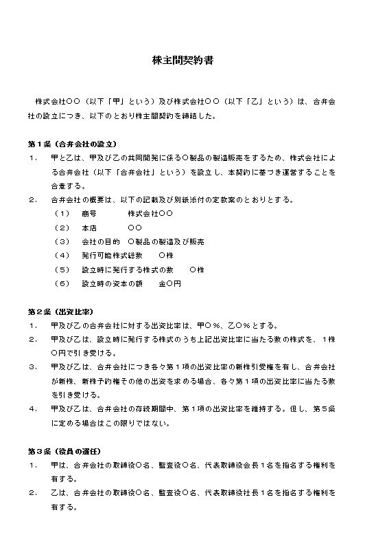 株式会社○○(以下「甲」という)及び株式会社○○(以下「乙」という)は、合弁会社の設立につき、以下のとおり株主間契約を締結した。