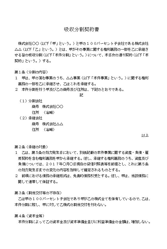 株式会社○○(以下「甲」という。)と甲の100パーセント子会社である株式会社△△(以下「乙」という。)とは、甲がその事業に関する権利義務の一部を乙に承継させる旨の吸収分割(以下「本件分割」という。)について、本日次の通り契約(以下「本契約」という。)する。