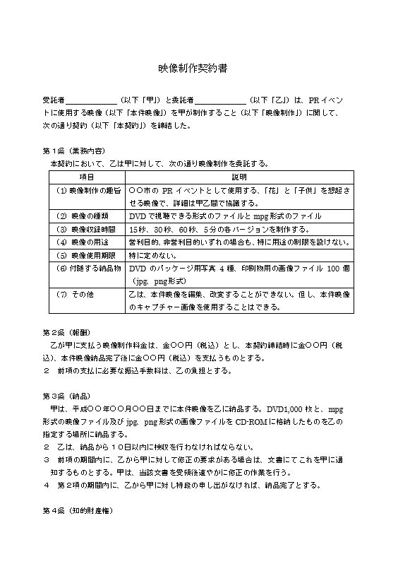 受託者 (以下「甲」)と委託者 (以下「乙」)は、PRイベントに使用する映像(以下「本件映像」)を甲が制作すること(以下「映像制作」)に関して、次の通り契約(以下「本契約」)を締結した。