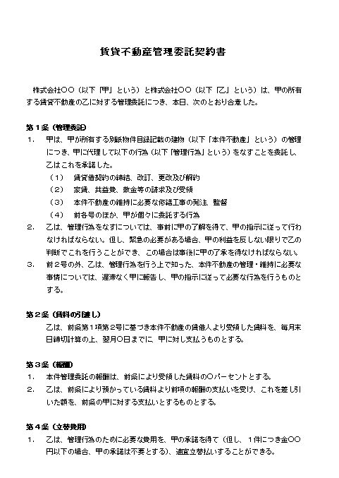 株式会社○○(以下「甲」という)と株式会社○○(以下「乙」という)は、甲の所有する賃貸不動産の乙に対する管理委託につき、本日、次のとおり合意した。