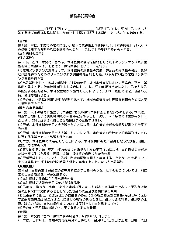 メンテナンス業務委託契約書 (以下「甲」)と (以下「乙」)は、甲が、乙に対し委託する機械の保守業務に関し、次のとおり契約(以下「本契約」という。) を締結する。 (目的) 第1条 甲は、本契約の定めに従い、以下の業務用工作機械(以下、「本件機械」という。) の保守に関する業務を乙に委託するものとし、乙はこれを受託するものとする。 (本件機械の表示) (保守業務) 第2条 乙は、本契約に基づき、本件機械の保守を目的として以下のメンテナンス及び出張を伴う業務(以下、あわせて「保守業務」という。) を行う。 (1)定期メンテナンス業務として、本件機械の消耗品の交換、部分品の耐久性の確認、良好な作動を保つためのクリーニング及び調整等を目的とした、○ヶ月に○回の定期メンテナンス業務を行う事 (2)出張業務として、本契約期間中に通常の使用により本件機械において不具合、不良、誤作動・異音・その他の故障が生じた場合においては、甲の申出速やかに応じ、乙または乙の指定する技術者が、本件設置場所へ出向くことによって、点検、原因の確定、部品の交換、修理等を行うこと (3)その他、上記に付帯関連する業務であって、機械の保守または円滑な利用のために必要な業務を行うこと (除外される業務) 第3条 以下の各号に該当する業務は、前条の保守業務に含まれないものとする。本条は、別途甲乙間において実施時期及び料金等を定めることにより、以下各号の作業が有償にて乙より行に対し提供され得ることを排除する主旨ではない。 (1)甲が、本件機械の使用方法を誤ったことによる・本件機械全部の分解及び組立てを要する作業 (2)甲が、本件機械の使用方法を誤ったことによる、本件機械の故障の復旧作業及びこれらに要する作業であって出張を伴うもの (3)甲が、本件機械の改造をしたことによる、本件機械に新たに必要となった調整、復旧、復帰、修復等の作業 (4)天災地変その他、甲乙いずれの責にも帰せられない不可抗力により、本件機械の全部または一部に生じた殿損、汚損、故障、損傷等の修復にかかる作業 (5)甲が要望したことにより、乙が、所定の回数を超えて実施することとなった定期メンテナンス業務または通常の対応時間を超えて実施することとなった出張業務 (費用負担) 第4条 本契約第2条所定の保守業務に要する費用のうち、以下のものについては、別に定める場合を除き、甲が負担する。 (1)本件機械の稼働にかかる水道光熱費 (2)本件機械の通常の使用にかかる消耗品費 (3)乙の責に帰さない事由により交換が必要となった部品のある場合であって甲乙別途協議の上有償にて交換することとなった部品の代金及び交換に係る費用 (4)出張業務に係る、乙または乙の技術者の移動に係る旅費交通費の実費(ただし甲において出張経費清算規程またはこれに準じる規程のあるときは、請求可否の判断、請求額の上限、請求の方法、支払い条件等については原則として当該規定に従う) (5)その他・甲乙別途協議の上、甲の負担と定めた費用 (対価) 第5条 本契約に基づく保守業務の対価は、月額○○万円とする。 2 甲は、乙に対し、前項の対価を毎月末日締切り、翌月○日(当該日が土曜・日曜、祭日等休日となるときは、その直前の営業日)までに乙の指定する銀行ロ座に振込む方法により支払うものとする。なお、振込手数料は甲の負担とする。 (対応時間) 第6条 乙の、甲に対する保守業務の実施日は、原則として平日のみとする。 2 乙の、甲に対する出張業務の実施対応時間は源則として平日の午前9より午後17時迄とする。 (再委託) 第7条 乙は、第三者に対し、本契約に定める保守業務の全部または一部を、第三者に対し委託することはできない。ただし、事前の甲の書面による承諾を得た場合は、当該承諾の範囲に限り、再委託をすることができる。 (秘密裸持義務) 第8条 甲及び乙は、保守業務遂行のため相手方より提供を受けた技術上または営業上その他業務上の情報(以下「秘密情報」という)を相手方の書面による事前の承諾なく第三者に開示または漏洩してはならない。ただし、次の各号のいずれか一つに該当する情報についてはこの限りではない。 (1)開示を受けた時点で秘密保持義務を負うことなく既に保有している情報 (2)秘密保持義務を負うことなく第三者から正当に入手したことを立証できる情報 (3)相手方から提供を受けた情報によらず、独自に開発したことを立証できる情報 (4)本契約及び個別契約に違反することなく、かつ、受領の前後を問わず公知となった情報 2 秘密情報の提供を受けた当事者は、当該櫃未情報の管理に必要な措置を講ずるものとし当該秘密情報を第三者に開示する場合は、事前に相手方からの書面による承諾を受けなければならない。ただし、法令の定めに基づきまたは権限ある官公署から開示の要求があった場合はこの限りでない。 3 乙は、自社の従業員及び役員のうち、保守業務のために秘密情報の開示を受ける必要のある者に対しては、前項の