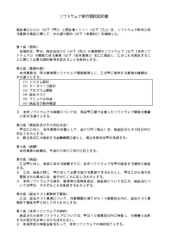 ソフトウェア制作委託契約書 委託者〇〇〇〇(以下「甲」)と受託者××××(以下「乙」)は、ソフトウェア制作に係る業務の委託に関して、次の通り契約(以下「本契約」)を締結した。 第1条(目的) 本契約は、甲が、株式会社○○(以下「丙」)の業務用のソフトウェア(以下「本件ソフトウェア」)の開発に係る業務(以下「本件業務」)を乙に委託し、乙がこれを受託することに関して必要な契約事項を定めることを目的とする。 第2条(業務内容) 本件業務は、丙の業務用ソフトウェア開発業務とし、乙が甲に提供する業務の種類は、次の通りとする。 (1)システム設計 (2)データベース設計 (3)プログラム開発 (4)総合テスト (5)マニュアル作成 (6)納品及び動作確認 2 本件ソフトウェアの詳細については、別途甲乙間で合意したソフトウェア開発仕様書に定める通りとする。 第3条(委託料及びその支払方法) 甲は乙に対し、本件業務の対価として、金○○円(税込)を、納品日から60日以内に支払うものとする。 2 振込先は乙の指定する金融機関口座とし、振込手数料は甲が負担する。 第4条(納期) 本件業務の納期は、平成○○年○○月○○日とする。 第5条(納品) 乙は甲に対し、前条に定める納期までに、本件ソフトウェアを甲の指定する場所に納品する。 2 乙は、納品に際し、甲に対して必要な協力を要請できるものとし、甲は乙から協力を要請された場合には、速やかにこれに応じるものとする。 3 本件ソフトウェアの滅失、毀損等の危険負担は、納品前については乙が、納品後については甲が、それぞれこれを負担するものとする。 第6条(総合テスト業務終了報告) 乙は、総合テスト業務について、作業期間の満了から14営業日以内に、総合テスト業務終了報告を甲に対して行うものとする。 第7条(本件ソフトウェアの検収) 納品された本件ソフトウェアについては、甲は10営業日以内に検査し、仕様書と合致するか否かを点検しなければならない。 2 本条所定の検査合格をもって、本件ソフトウェアの検収完了とする。 第8条(瑕疵担保責任) 検収完了後、本件ソフトウェアについて隠れた瑕疵があった場合、甲は乙に対して瑕疵の修正を請求することができ、乙は、当該瑕疵を修正しなければならない。 2 乙が係る修正責任を負うのは、検収完了後1年以内に甲から請求がなされた場合に限るものとする。 第9条(納入物の所有権) 乙が本契約に従い甲に納入する本件ソフトウェアの所有権は、本契約に係る委託料が支払われた日をもって、乙から甲へ移転する。 第10条(納入物の著作権) 本件ソフトウェアに関する著作権は、甲に帰属するものとする。 2 前項にかかわらず、乙が本契約締結前より保有していた著作物の著作権については、乙に帰属するものとする。 3 乙は、本件ソフトウェアに関して著作者人格権を行使しないものとする。 第11条(資料等の提供及び返還) 甲は、本契約に定める条件に従い、当該個別業務遂行に必要な資料等の開示、貸与等の提供を行う。 2 前項に定めるもののほか、乙から甲に対し、本件業務遂行に必要な資料等の提供の要請があった場合、甲乙協議の上、甲は乙に対しこれらの提供を行う。 3 本件業務遂行上、甲の事務所等で乙が作業を実施する必要がある場合、甲は当該作業実施場所を、甲乙協議の上、乙に提供するものとする。 4 甲が前各項により乙に提供する資料等または作業実施場所に関して、内容等の誤りまたは甲の提供遅延によって生じた乙の本件業務の履行遅滞、本件ソフトウェアの瑕疵等の結果については、乙はその責を免れるものとする。 5 甲から提供を受けた資料等が本件業務遂行上不要となったときは、乙は遅滞なくこれらを甲に返還または甲の指示に従った措置を講ずるものとする。 第12条(資料等の管理) 乙は、甲から提供された本件業務に関する資料等を善良な管理者の注意をもって管理、保管し、かつ、本件業務以外の用途に使用してはならない。 2 乙は、甲から提供された本件業務に関する資料等を本件業務遂行上必要な範囲内で複製または改変できる。 第13条(秘密情報の取扱い) 甲及び乙は、本件業務遂行のため相手方より提供を受けた技術上または営業上その他業務上の情報のうち、相手方が書面により秘密である旨指定して開示した情報、または口頭により秘密である旨を示して開示した情報で開示後10日以内に書面により内容を特定した情報を秘密情報と定めるものとする。但し、次の各号のいずれか一つに該当する情報については秘密情報には該当しない。 一 秘密保持義務を負うことなくすでに保有している情報 二 秘密保持義務を負うことなく第三者から正当に入手した情報 三 相手方から提供を受けた情報によらず、独自で開発した情報 四 本契約に違反することなく、かつ、受領の前後を問わず公知となった情報 2 甲及び乙は、秘密情報を第三者に漏洩してはならない。但し、事前に相手方からの書面による承諾を受けることにより、第三者へ開示することができる。なお、