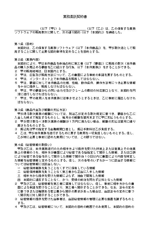 業務委託契約書 (以下「甲」)と (以下「乙」)は、乙の保有する業務ソフトウェアの販売取次に関して、次の通り契約(以下「本契約」)を締結した。 第1条(目的) 本契約は、乙の保有する業務ソフトウェア(以下「本件商品」)を、甲が取次店として販売することに関して必要な契約事項を定めることを目的とする。 第2条(業務内容) 本契約により、甲は本件商品を非独占的に第三者(以下「顧客」)に販売の取次(本件商品の購入が見込める顧客を乙に紹介する行為、以下「本件業務」)をすることができる。 2 甲の販売地域は、日本国内とする。 3 甲は、広告及び販売方法について、乙の書面による事前の承諾を要するものとする。 4 甲は、インターネット上で本件商品を販売してはならない。 5 甲は、顧客に対して本件商品の仕様、性能、動作条件、操作方法等につき必要な情報を十分に提供し、販売しなければならない。 6 甲は、甲の顧客からの問い合わせ及びクレームの最初の対応窓口となり、本契約を円滑に遂行しなければならない。 7 甲は、甲の使用人を本件業務に従事させようとするときは、乙に事前に届出しなければならない。 第3条(商品代金及び報酬の支払方法) 甲が得る取次業務の報酬については、別途乙が定める取次規定に基づき、顧客から乙に入金した時点で発生するものとし、毎月分の報酬を翌月末までに甲に支払うものとする。 2 甲が受け取るべき取次業務の報酬が1万円に満たない場合、報酬の支払は翌月に繰り越されるものとする。 3 振込先は甲の指定する金融機関口座とし、振込手数料は乙が負担する。 4 乙は、甲が本件業務を遂行するために要する費用を一切負担しないものとする。但し、乙が特に必要と事前に認めた費用については、この限りではない。 第4条(秘密情報の取扱い) 甲及び乙は、本件業務遂行のため相手方より提供を受けた技術上または営業上その他業務上の情報のうち、相手方が書面により秘密である旨指定して開示した情報、または口頭により秘密である旨を示して開示した情報で開示後10日以内に書面により内容を特定した情報を秘密情報と定めるものとする。但し、次の各号のいずれか一つに該当する情報については秘密情報には該当しない。 一 秘密保持義務を負うことなくすでに保有している情報 二 秘密保持義務を負うことなく第三者から正当に入手した情報 三 相手方から提供を受けた情報によらず、独自で開発した情報 四 本契約に違反することなく、かつ、受領の前後を問わず公知となった情報 2 甲及び乙は、秘密情報を第三者に漏洩してはならない。但し、事前に相手方からの書面による承諾を受けることにより、第三者へ開示することができる。なお、法令の定めに基づきまたは権限ある官公署から開示の要求があった場合は、当該法令の定めに基づく開示先に対し開示することができる。 3 秘密情報の提供を受けた当事者は、当該秘密情報の管理に必要な措置を講ずるものとする。 4 甲及び乙は、秘密情報について、本契約の目的の範囲でのみ使用し、本契約の目的の範囲を超える複製、改変が必要なときは、事前に相手方から書面による承諾を受けるものとする。 5 甲及び乙は、秘密情報を本契約の目的のために知る必要のある各自の役員及び従業員に限り開示するものとし、本契約に基づき甲及び乙が負担する秘密保持義務と同等の義務を、秘密情報の開示を受けた当該役員及び従業員に退職後も含め課すものとする。 6 本条の規定は、本契約終了後も存続する。 第5条(個人情報) 甲は、個人情報の保護に関する法律に定める個人情報のうち、本件業務遂行に際して乙より取扱いを委託された個人データまたは、本件業務遂行のため、甲乙間で個人データと同等の安全管理措置を講ずることについて、個別契約その他の契約により合意した個人情報を第三者に漏洩してはならない。 2 乙は、個人情報を甲に提示する際にはその旨明示するものとする。 3 乙は、乙の有する個人情報を甲に提供する場合には、業務遂行上必要な最小限度にとどめ、個人が特定できないよう加工した上で、甲に提供するよう努めるものとする。 4 甲は、個人情報の管理に必要な措置を講ずるものとする。 5 甲は、個人情報について、本契約の目的の範囲でのみ使用し、本契約の目的の範囲を超える複製、改変が必要なときは、事前に乙から書面による承諾を受けるものとする。 6 本契約の終了後、甲は遅滞なく個人情報を乙に返還または甲の指示に従った処分等の措置を講ずるものとする。 7 甲は、個人情報の取扱いを第三者に委託することができないものとする。 8 本条の規定は、本契約終了後も存続する。 第6条(契約解除) 甲及び乙は、相手方が本契約のいずれかの条項に違反し、相当期間を定めてなした催告後も、相手方の債務不履行が是正されない場合は、本契約の全部または一部を解除することができる。 第7条(期限の利益喪失) 甲及び乙は、相手方に次の各号のいずれか一つに該当す