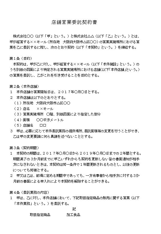 株式会社○○(以下「甲」という。)と株式会社△△(以下「乙」という。)とは、甲が経営する××モール(所在地 大阪府大阪市△区○○)の営業実施場所における営業を乙に委託するに際し、次のとおり契約(以下「本契約」という。)を締結する。